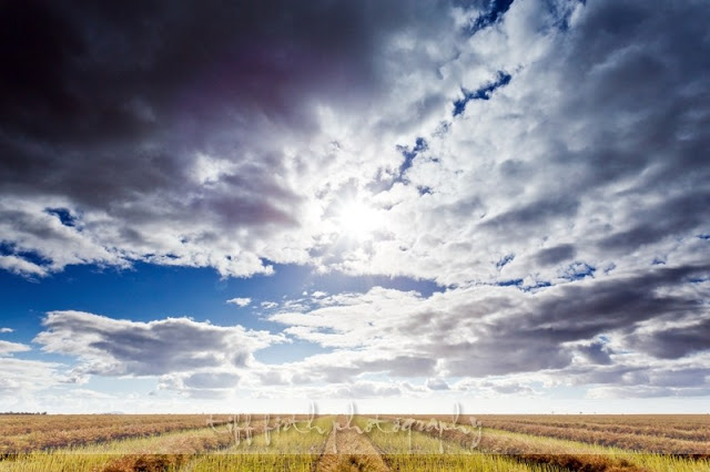 I went out in the paddock yesterday to photograph the very newly wind-rowed canola. In fact, the wind-rower was still working in the paddock when I was taking my shots lol. All the elements were there yesterday. The sun, the clouds, the fresh rows before they settle into the stubble and get windblown. I even commandeered Kym's ute so to use the tray for extra height.